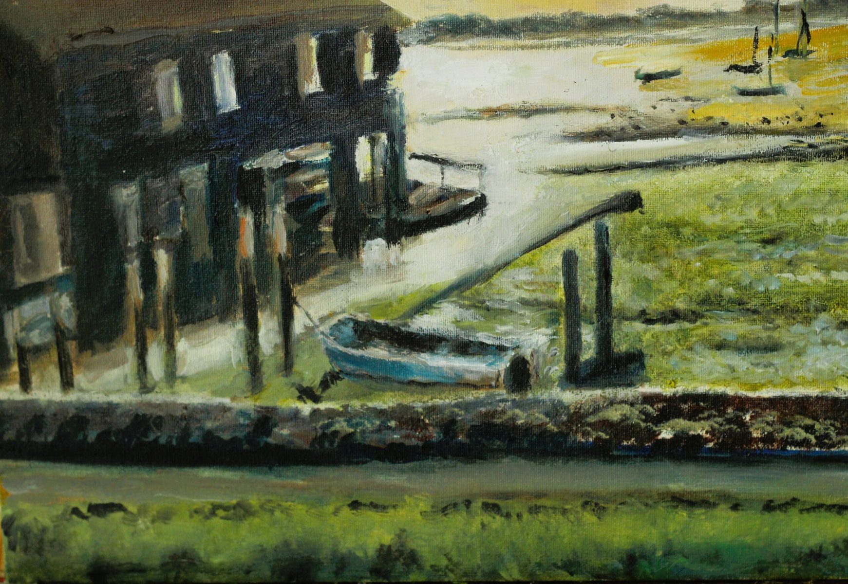 Oil painting of Bosham Harbour, on board.